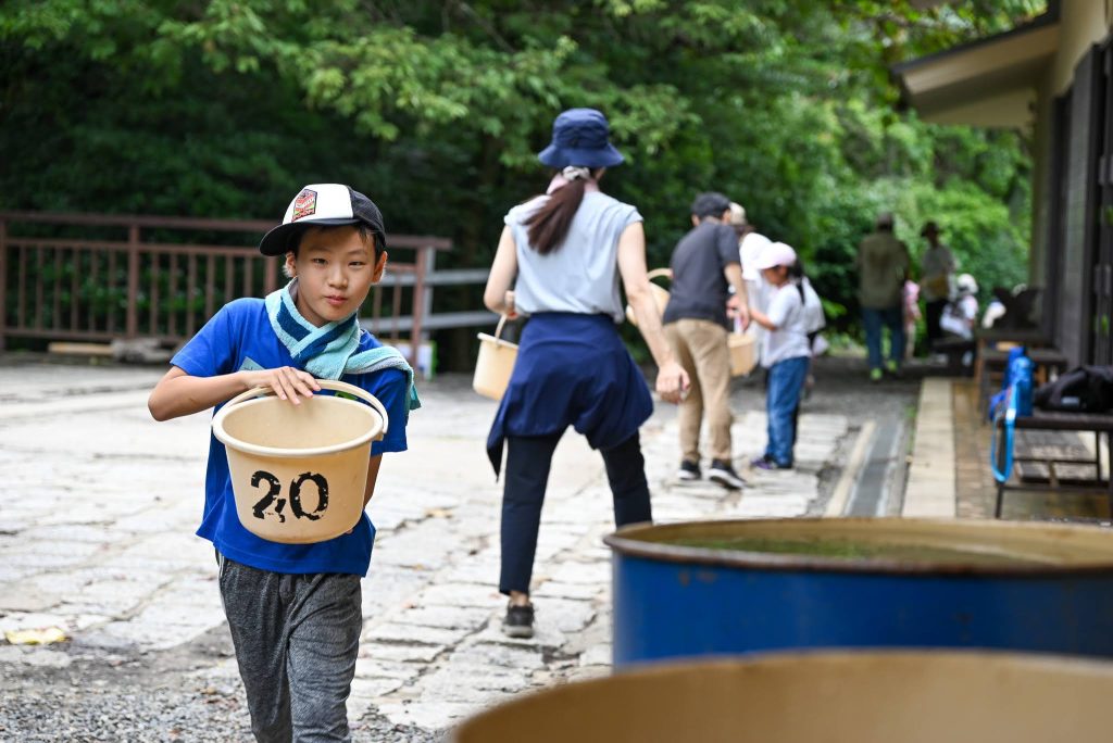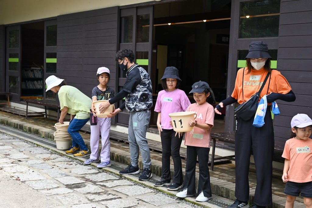 火災のときなどに役立つバケツリレーを体験しました。水の量や相手との間隔を考えながら、ドラム缶一杯を目指してリレーをつなぎました。