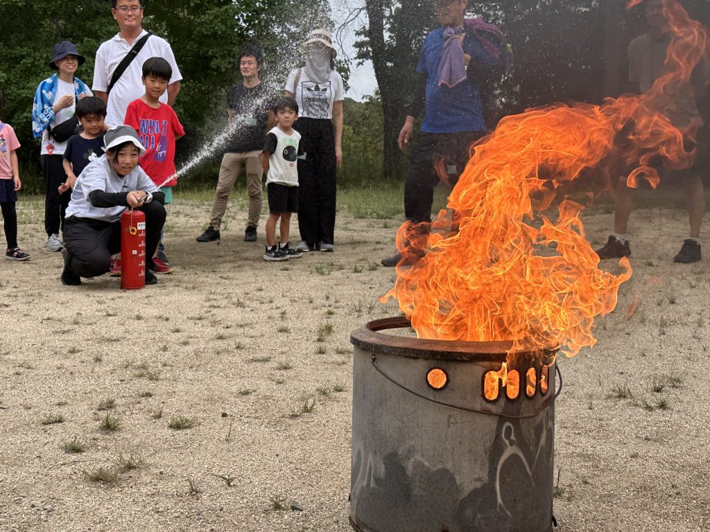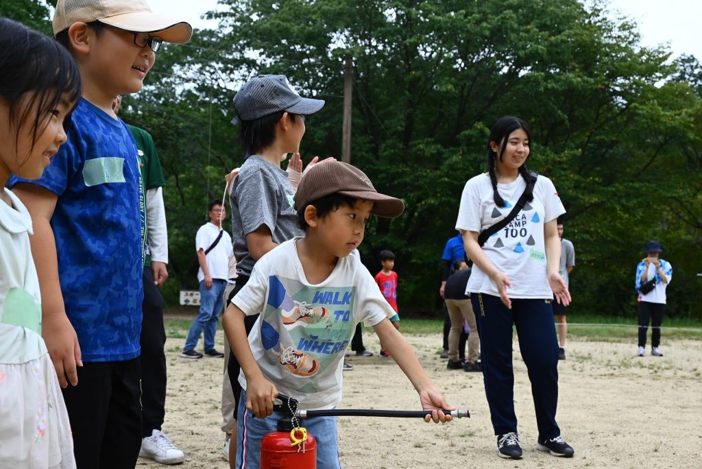4つの活動後、避難訓練を行いました。緊急放送を聞いて安全に冒険の広場まで避難しました。その後は、水消火器で消火訓練をしました。