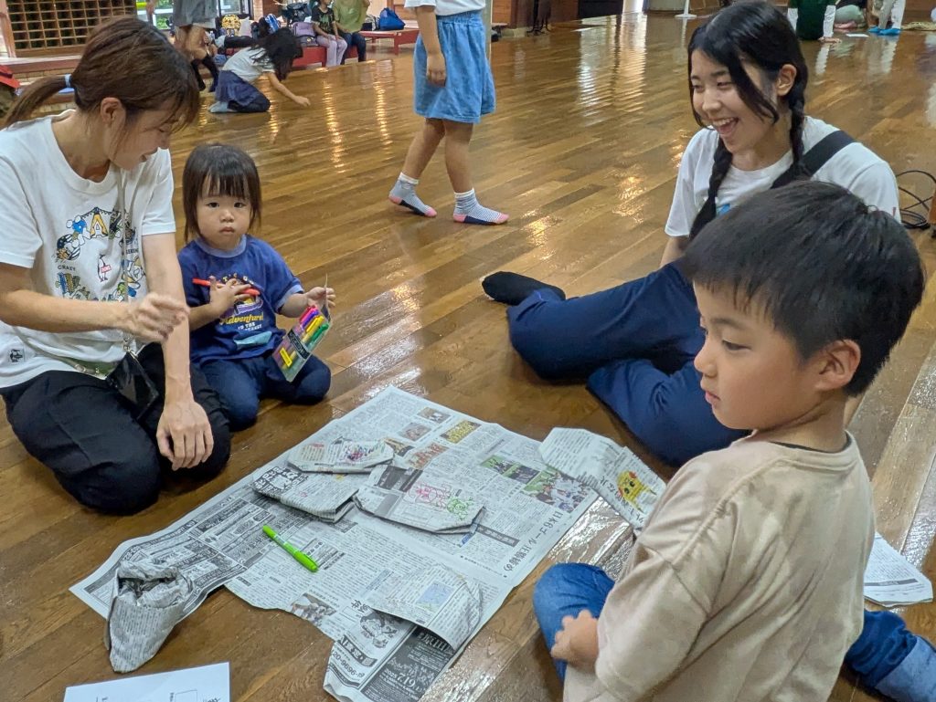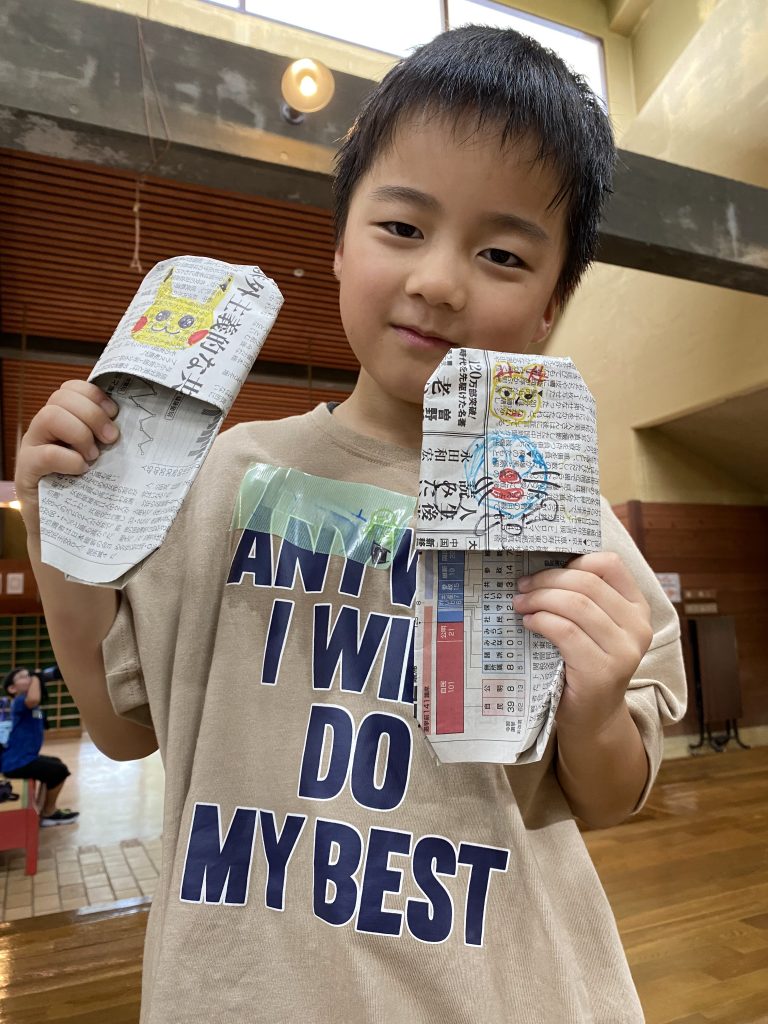 災害時、足の保護や防寒のための新聞紙スリッパです。比較的簡単に仕上がり、子どもたちは好きな絵や模様を描き、楽しく防災グッズを製作しました。