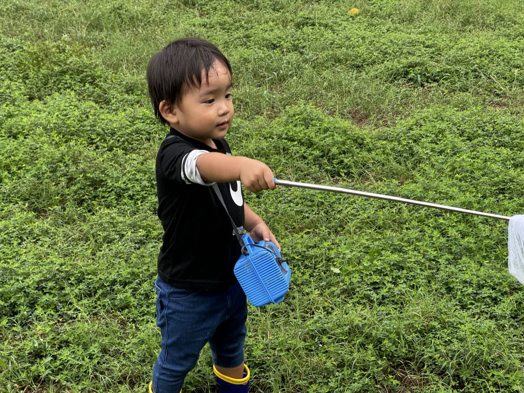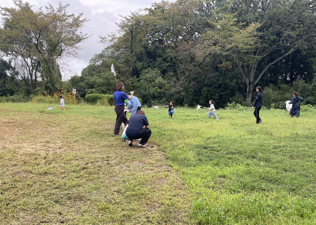 こどもたちは持ってきた虫捕り網を使って、トンボやバッタ捕りに挑戦。「なかなか入ってくれない~。」と言いながらも、何度も網を振っていました。捕まえたトンボは虫カゴにいれて嬉しそうに見ていました。
