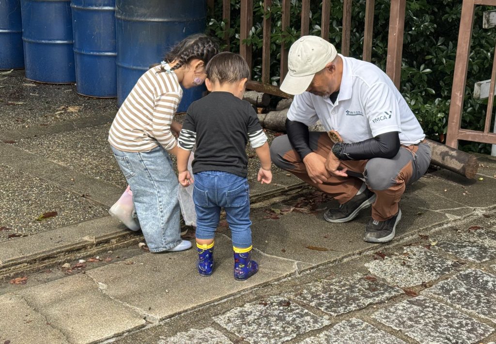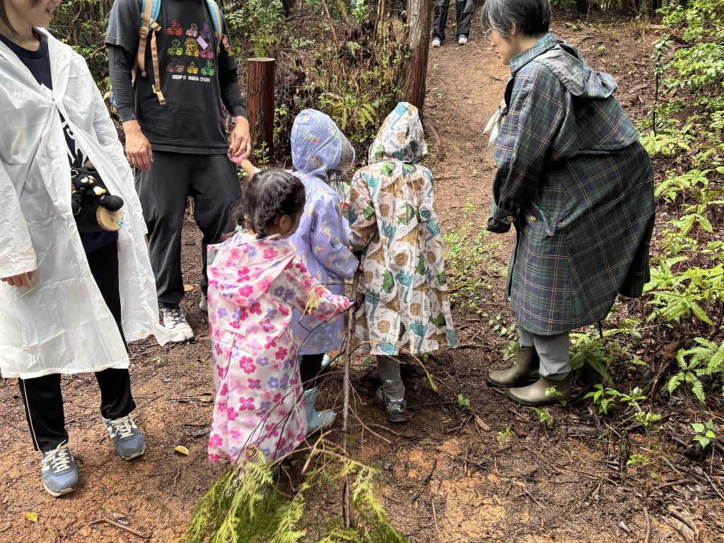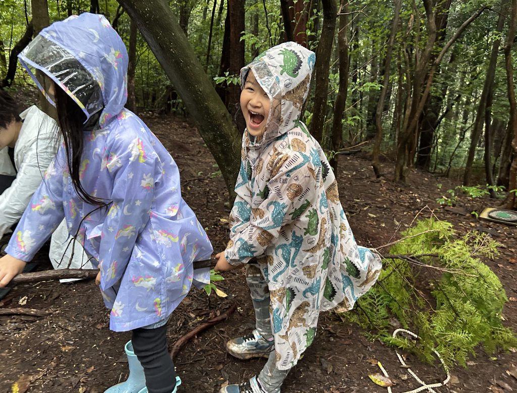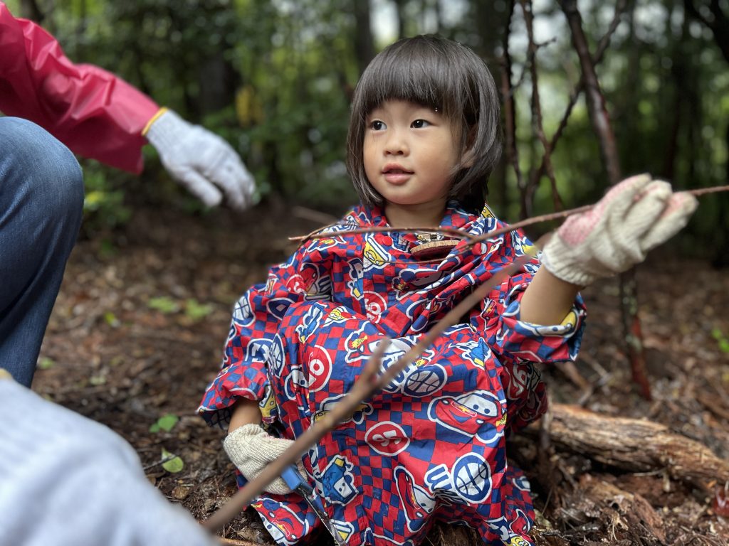 紐で作った輪の中に入って電車ごっこで遊んだり。のこぎりを使って根気強く枝を切り、「切れた!」と満面の笑顔を見せたり。「雨が降ってきた~」と木を揺らして雨水を落として遊んでいました。