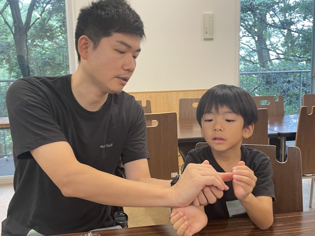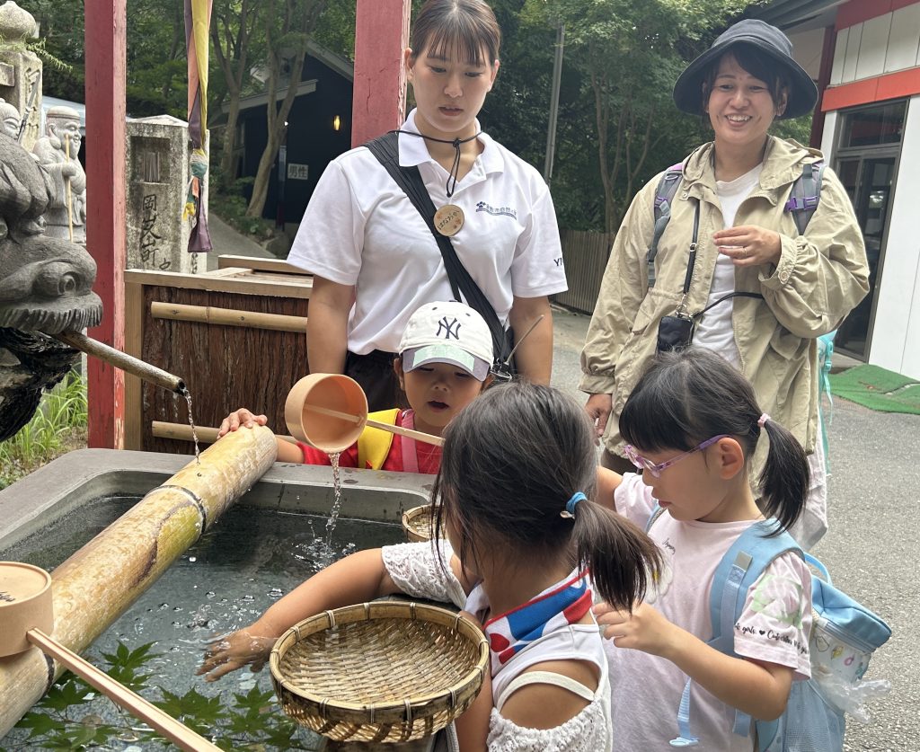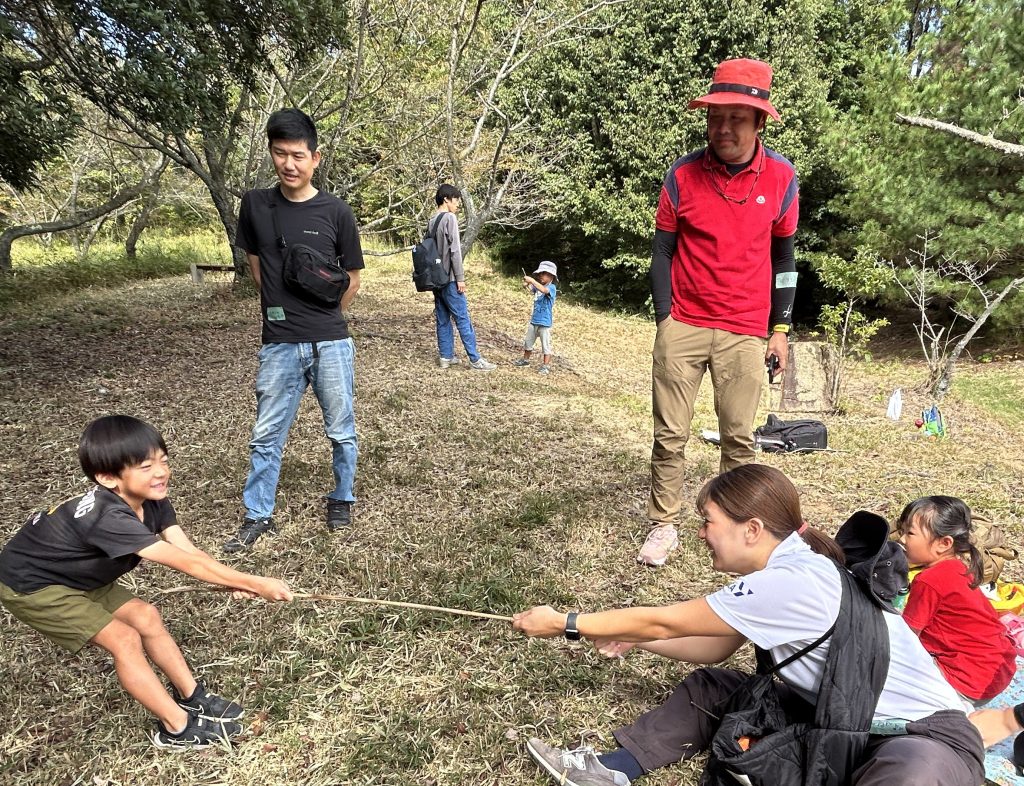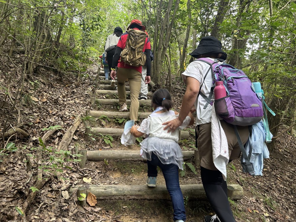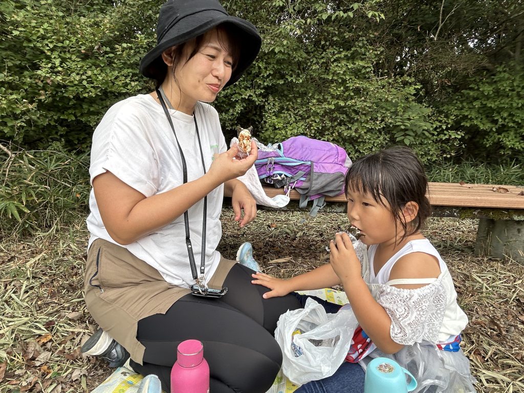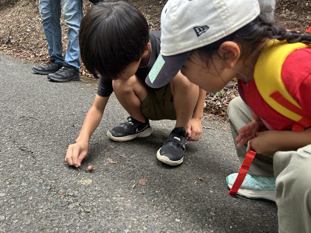 いよいよハイキングに出発!序盤は上りの坂や階段の連続で、疲れが出ないか心配でしたが、ドングリや生き物を見つけながら楽しく歩くことができました。途中、佐渡稲荷神社で景色を眺めながらの休憩をとりました。休憩の後は下りが多く、のんびりと歩みを進め、昼食場所の桜園地に無事到着しました。