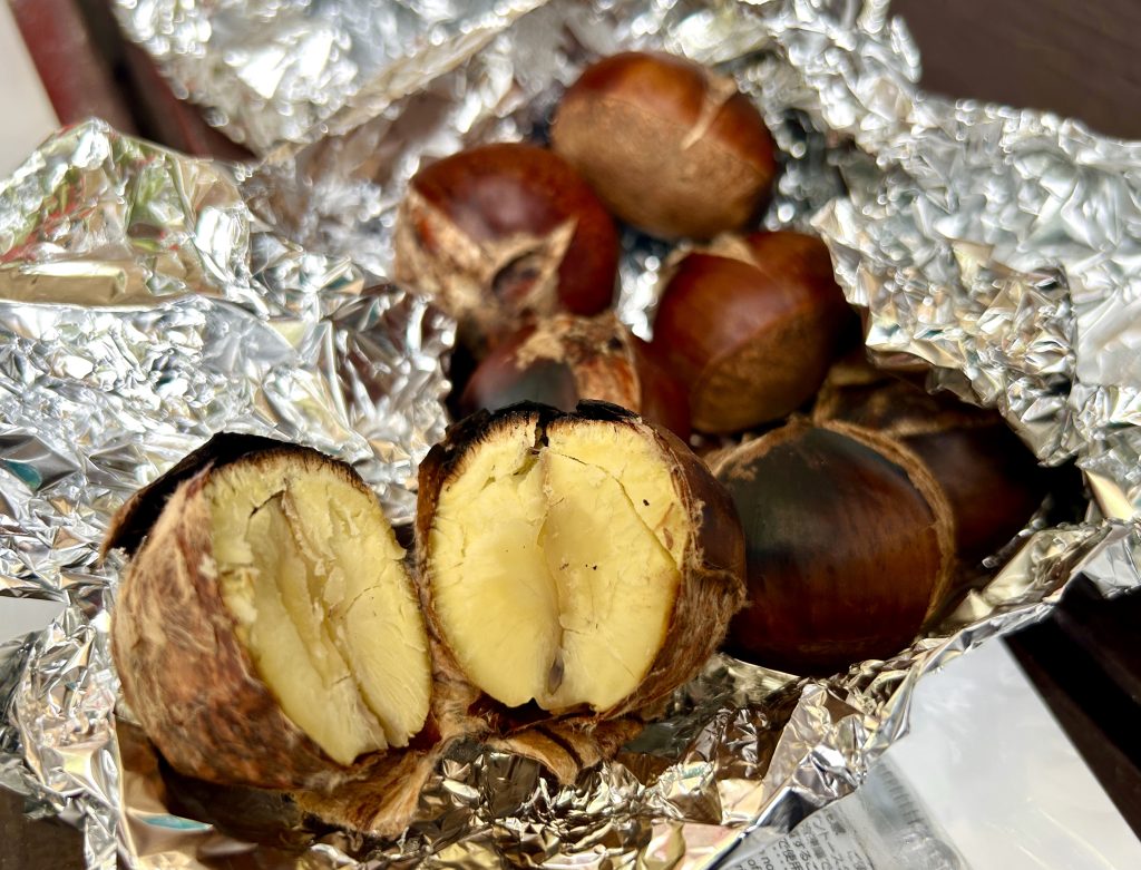 たき火で作った焼きグリを食べました。初物という方がほとんどで、秋の味覚を味わいました。