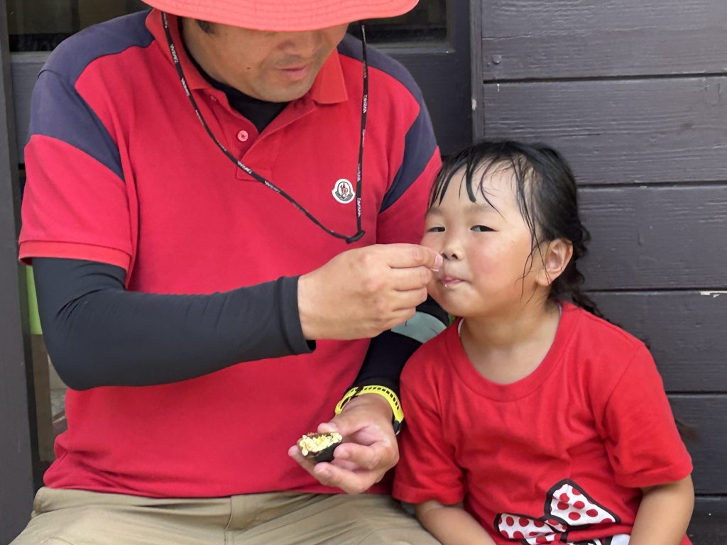桜園地で作ったおにぎりの昼食です。自分で作ったおにぎりの味はやっぱり格別ですね。食後は森に探険に行ったり、笹笛を作ったりして遊びました。