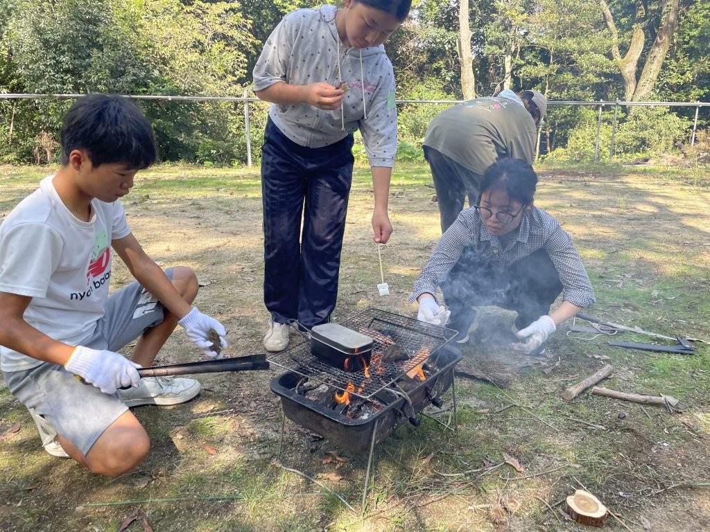 周りから枝を拾ってきて、だんだんと火が安定してきました。メスティンでお湯を沸かしてラーメンを食べたり、トウモロコシやおいもを焼いて食べていました。