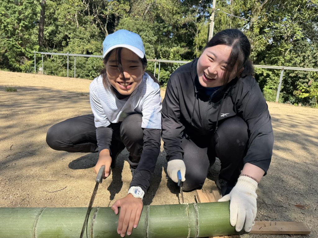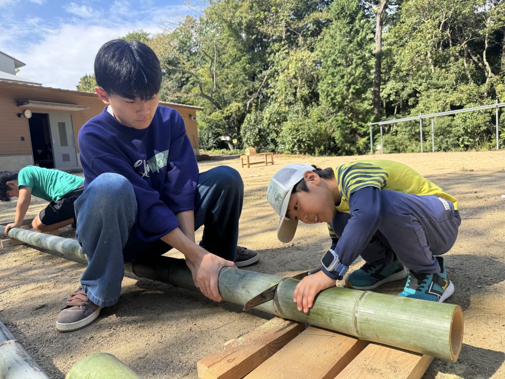 今月は竹クラフトが大好評。竹の箸を作ったり、お椀を作って、昼食の時に使っている人がいたり、木材に釘を打って遊んだり、のこぎりで切って遊んでいました。