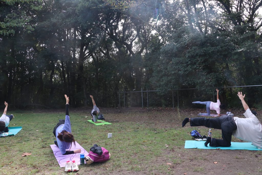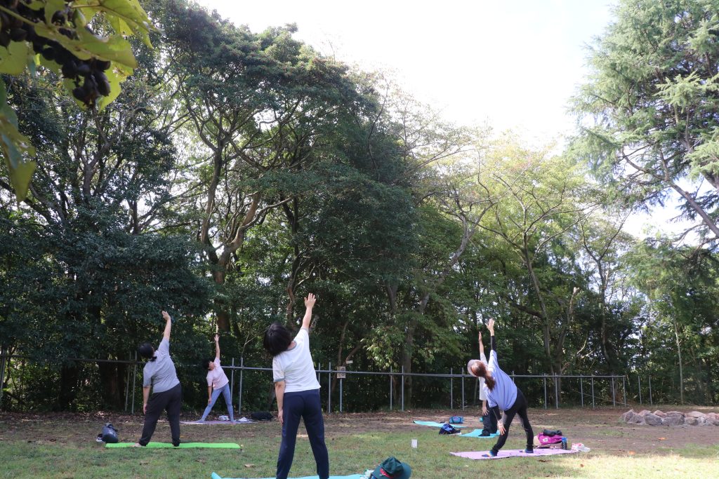 今回も、ヨガ講師の安部紀子先生の指導で、呼吸を意識しながら、ゆったりヨガで、気持ちよく体を伸ばしました。曇りがちの空でしたが、ヨガを進めるうちに青空が見え出し、小鳥たちや秋の虫の声に耳を傾けたりして、五感をフルに使って、心地よい時間を過ごしました。