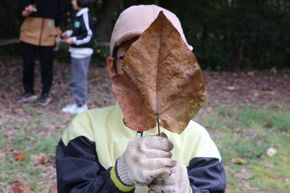 フィールドビンゴで秋の自然をさまざまな感覚で味わうとともに、ペアでいっぱいシェアをしました。最後に、全員で目かくしイモムシを行いました。リーダーが目かくしをした全員を連れて、自然を散策し、視覚以外の感覚で自然をたっぷり味わってもらいました。光や明るさを感じたり、地面のちがいを味わったり、さまざまな音を聞き分けたり、木の実やクモの糸をさわったりして、ドキドキしながらも五感を使う活動を楽しみました。すっかり感覚が鋭くなった感じがしたようです。