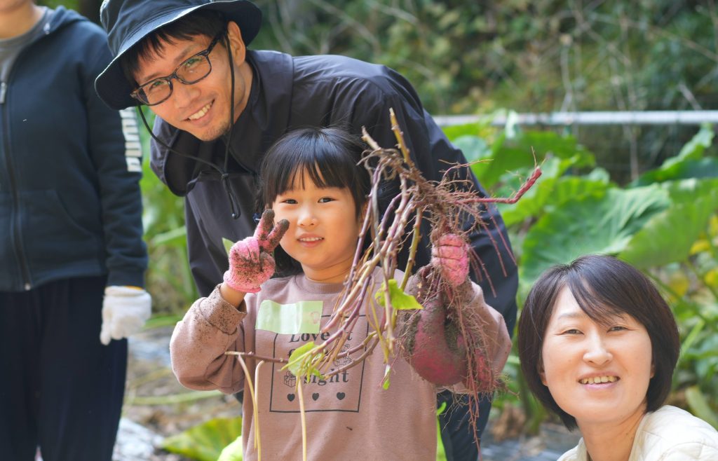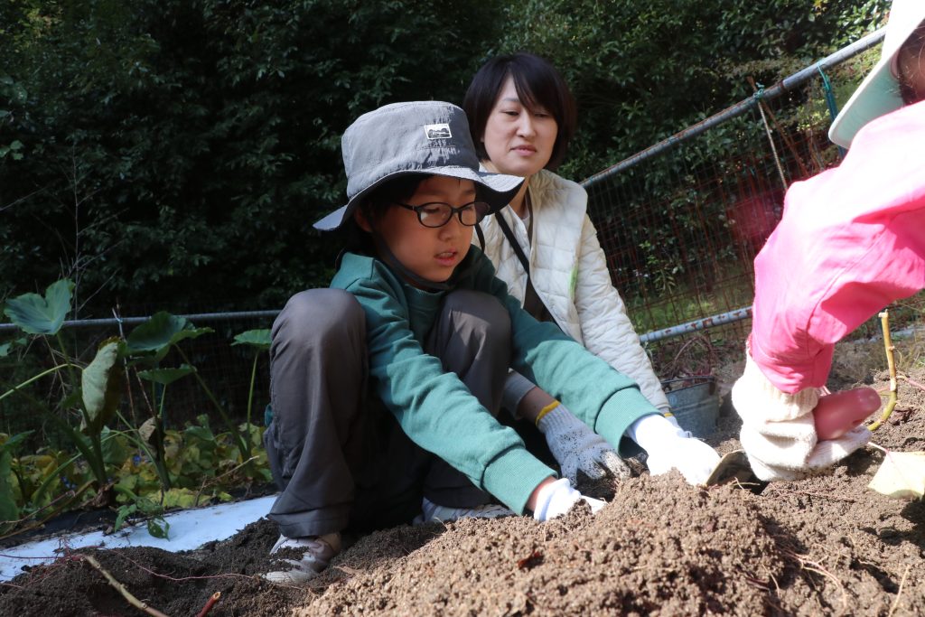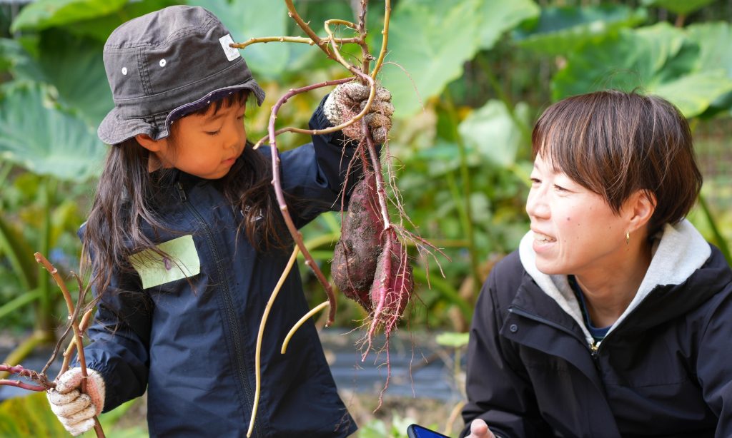 開会行事の後、農園でサツマイモとサトイモを収穫しました。予定時間内に掘り切れないほどの豊作で、参加者のみなさんは大興奮!特にサトイモは大人の方で初めて掘ったとの声もあり、よい収穫体験になりました。