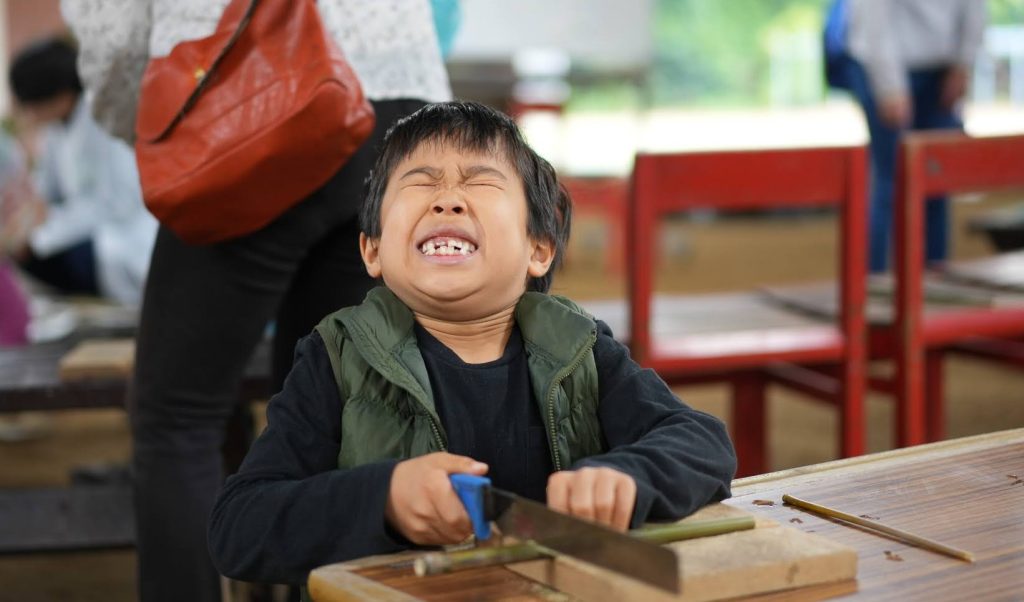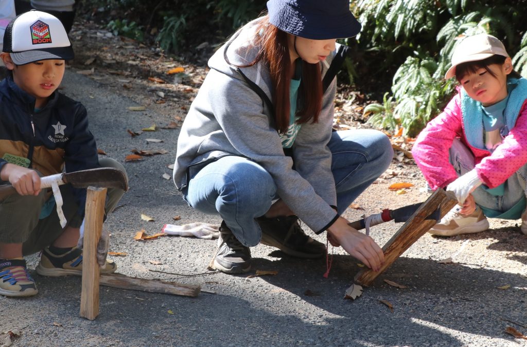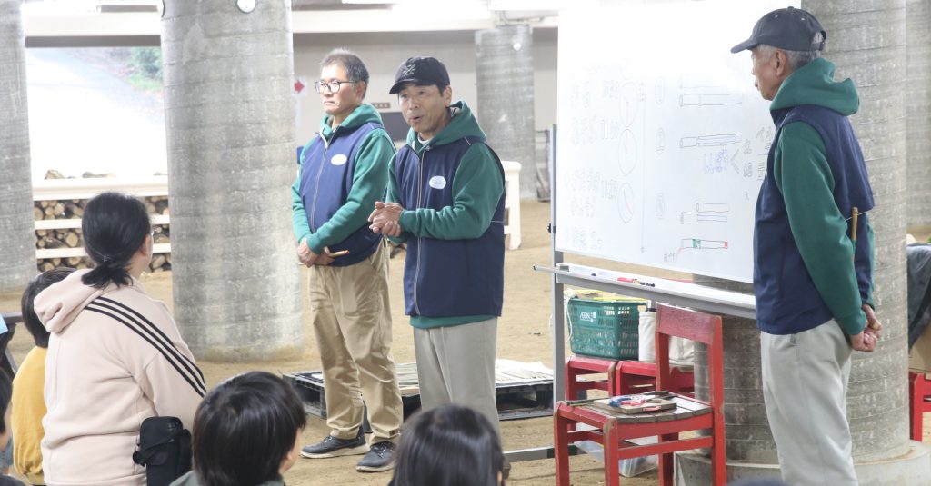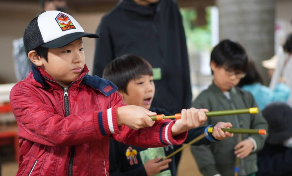 2日目の活動は、鷲羽竹細工の会のみなさんを講師に迎えて、竹鉄砲を作りました。竹で砲身と押し出し棒を作り、クスノキの実を弾にして飛ばしました。撃つのは少しコツが必要でしたが、飛んだときの「パン」という音が最高に気持ちいい!的当てコーナーもあり、作って遊ぶこともできて大盛況でした。