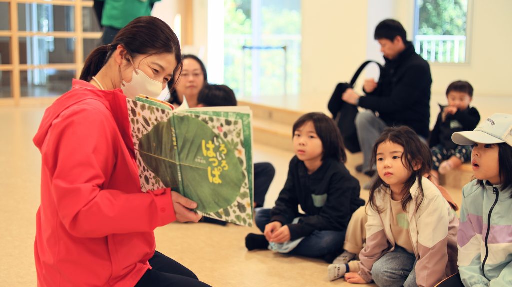 参加者は7家族23名。自己紹介のあと、絵本「いろいろはっぱ」の読み聞かせからスタートです。自然の中にはいろいろな大きさや色、形、手ざわりがあることを知って、それらをさがして遊ぼうと外に飛び出しました。