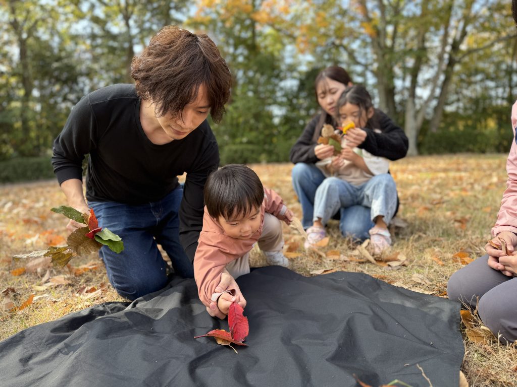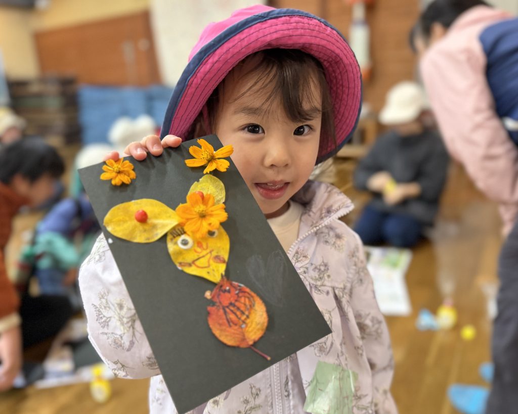 最後は、「ばけばけはっぱ」の絵本を読んでから、思い思いに自分たちなりの「ばけばけはっぱ」を作り、すてきな落ち葉アートを完成させました。