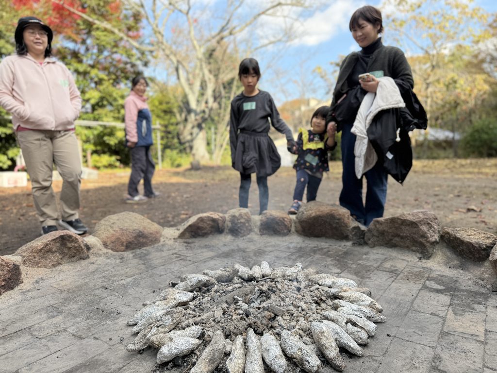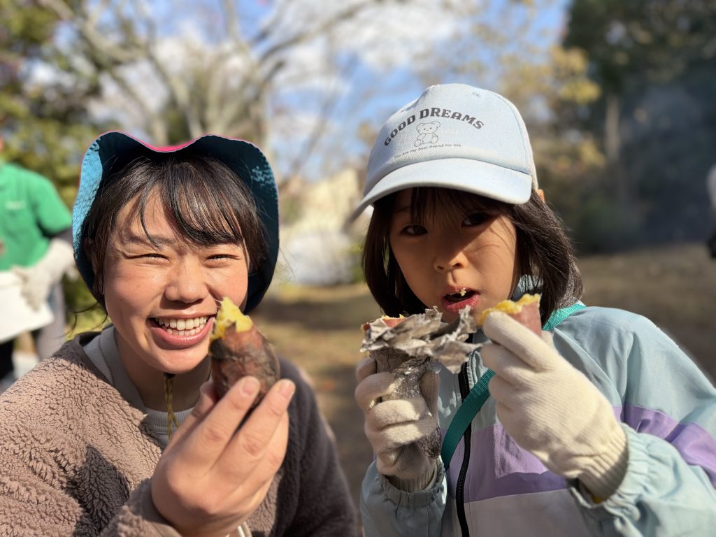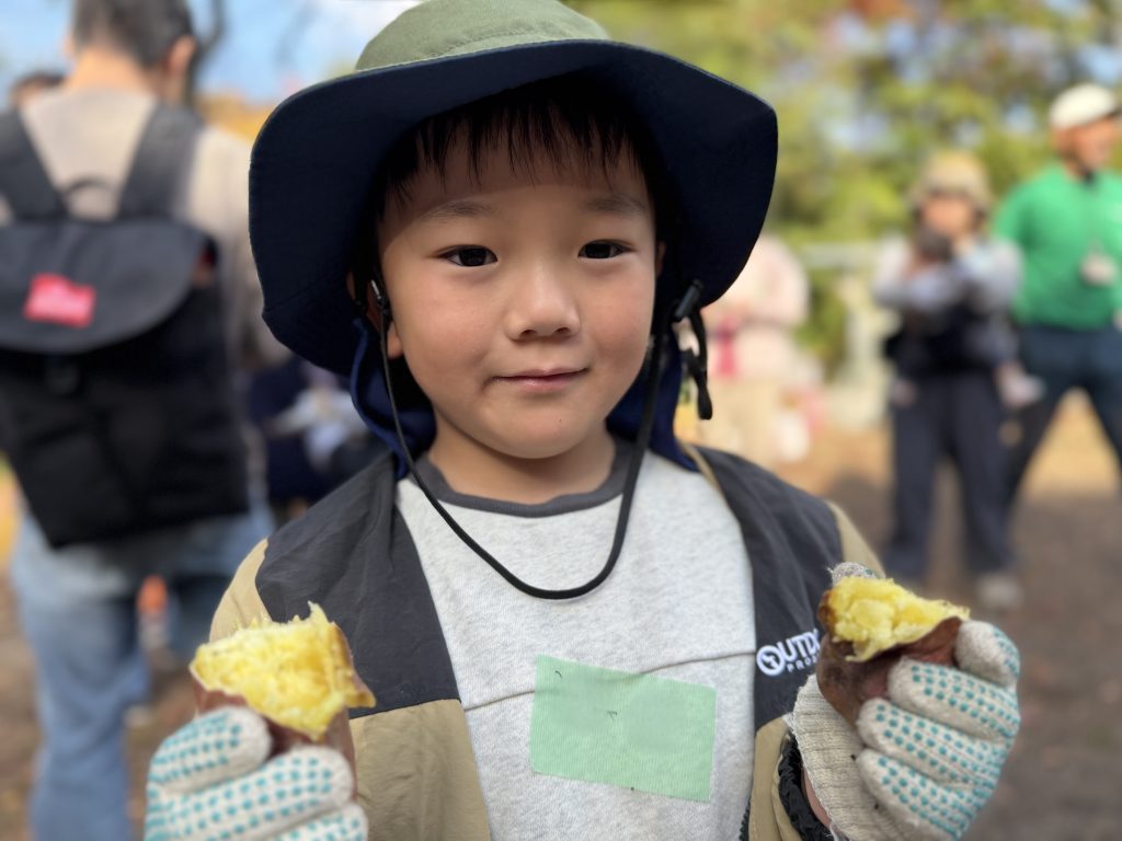 アート作品ができると、たき火に集合。すっかり火は消え、焼き芋が完成していました。自分が包んだものを覚えている人がたくさんいてびっくりしましたが、アルミホイルを開け、顔をのぞかせた焼き芋に誰もが笑顔。食べてみて、さらに笑顔。笑顔の花が咲くというのは、こういうことですね。大満足の今月の旬の味でした。今回のお芋は、ほくほく系やしっとり系、さまざまな種類があり、どれがあたるかはお楽しみでした。どれも、おいしかったようで、満足、満足でした。
