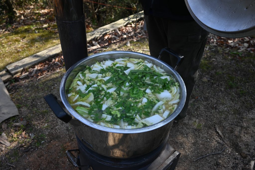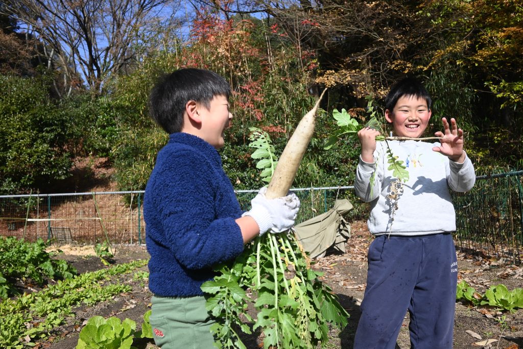収穫した野菜をプレーパークに持ち帰り、「お味噌汁の具にしよう」という声が上がり、さっそく調理が始まりました。大根がたっぷり入ったお味噌汁は、寒いこの日にぴったりで、お昼ご飯の時間にはみんなで囲んで味わうことができました。自分たちで収穫した野菜が入っていることもあり、いつも以上に印象に残る一杯になったようでした。