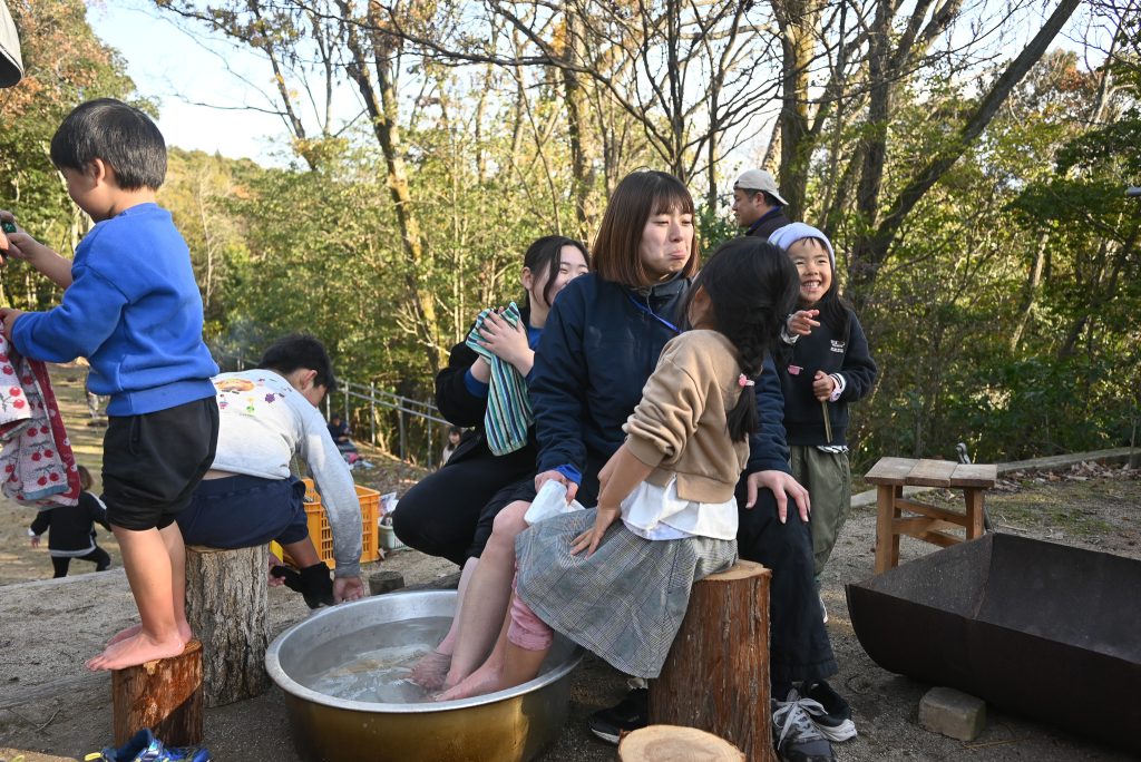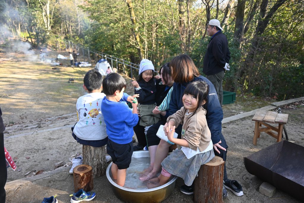 午後も遊びは途切れることなく続きました。お父さんやお母さんは焚き火のそばを離れず、自然と大人同士の会話が生まれ、ゆったりとした時間を過ごしていました。一方で、こどもたちはタライに水を張り、焚き火の上にセットして「足湯をしよう」とリーダーと一緒に準備を始めました。思っていたよりも熱いお湯ができあがり、冷めるのを待ちながら順番に足を入れては「熱い」「ちょうどいい」と感想を言い合い、あっという間にぬる湯になっていく過程も含めて楽しんでいる様子でした。