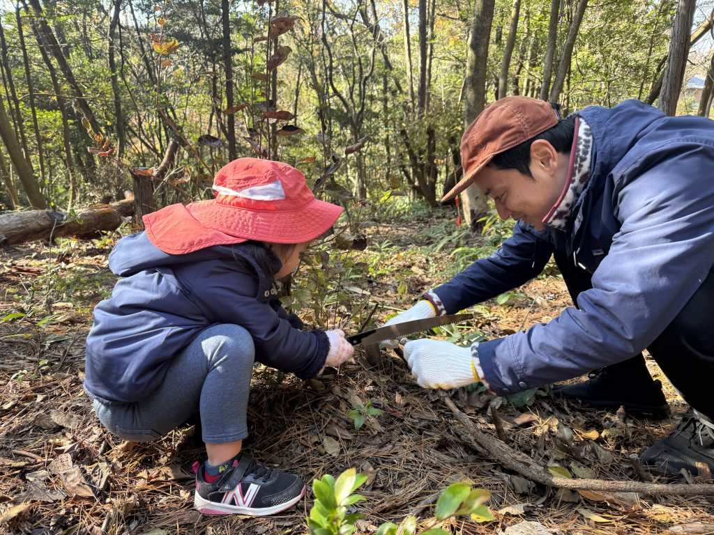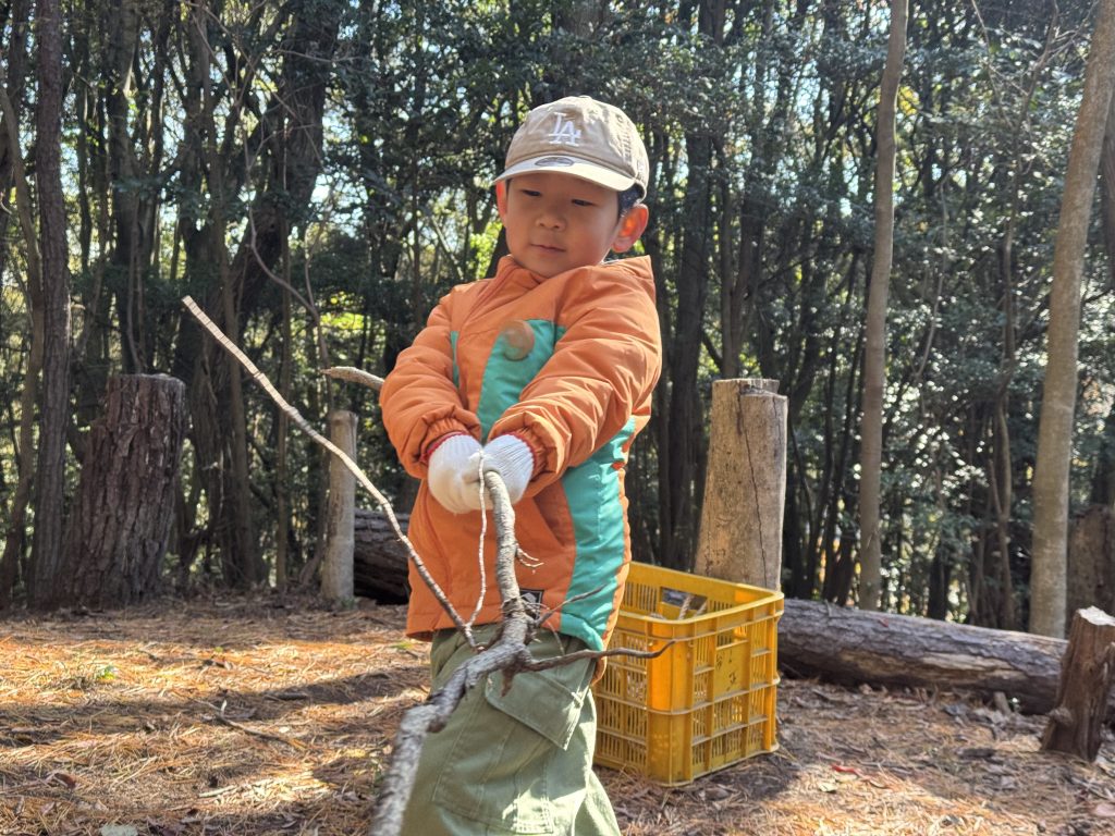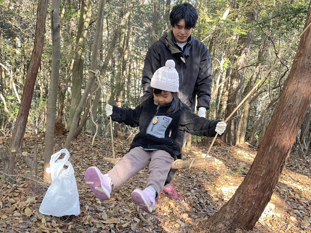 「テントウムシみたいにちいさい虫がいたよ!」「大きい葉っぱ見つけた~」「くねくねした木を発見したよ!」と、たくさんの気づきを共有してくれました。ロープでブランコを作ったり、のこぎりで木を切ってみたりと、色々なことに挑戦しました。