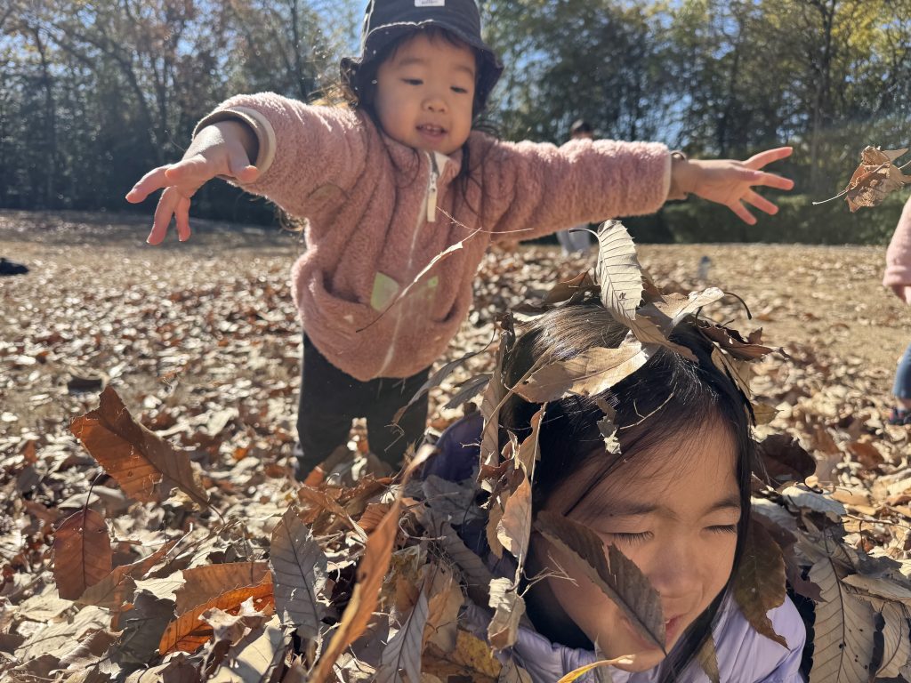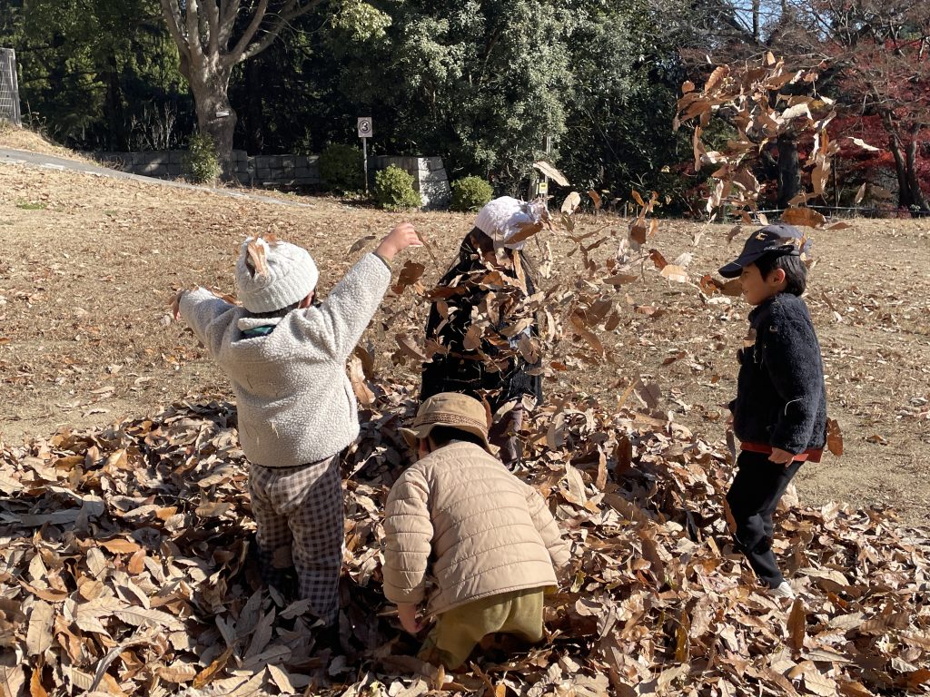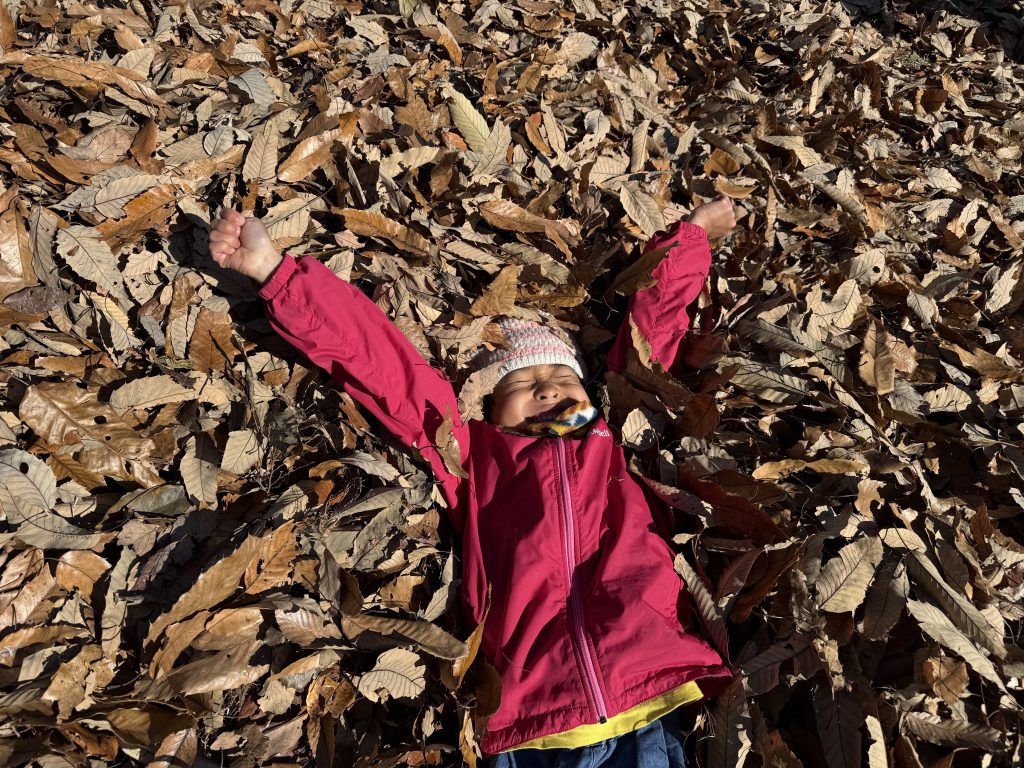 昼食を食べた後、子どもたちは一面の落ち葉の山で遊びました。「リーダーを隠すぞ〜」と声を掛け合い、みんなで協力してリーダーを落ち葉で埋めたり、上に投げてパラパラと舞い落ちる落ち葉を楽しみました。