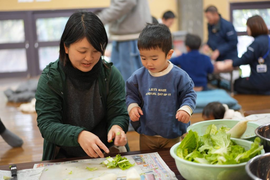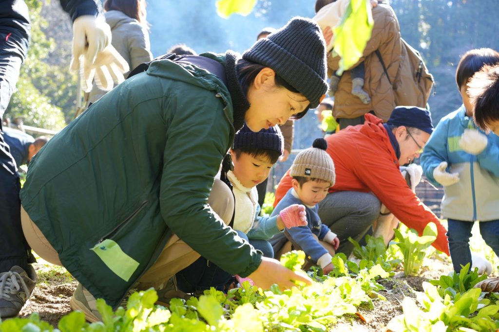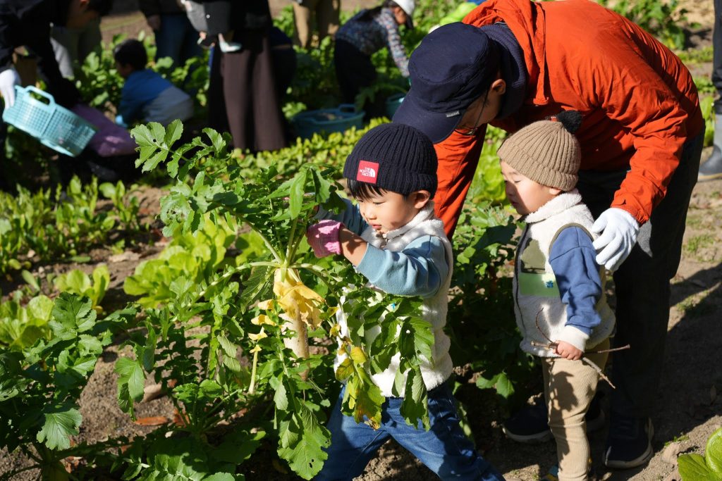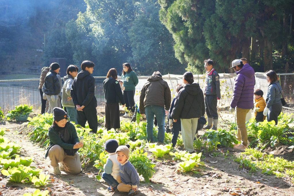 まずは、鍋の材料としてダイコン、ミズナ、シュンギク、ハクサイを収穫しました。カゴいっぱいに収穫した野菜を調理用とおみやげ用に分けて、しょうやくをしました。