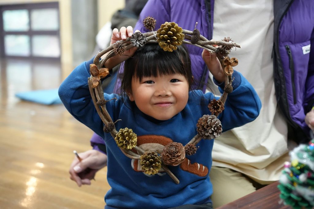 事前に採取しておいたカズラを好きな大きさに編み、木の実などで自由に飾り付けました。