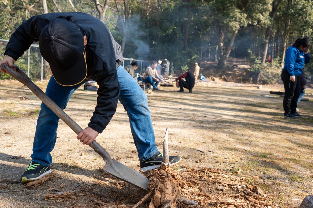 この日も、会場では火おこしを中心に、それぞれが思い思いの遊びを見つけて過ごしていました。家族で協力しながら火を起こす姿や、土を掘ったり整えたりする土木作業に黙々と取り組む姿など、特に決まった遊びを用意しなくても、自然と場が動いていく様子が見られました。リーダーはおでんを仕込んで準備をし、お昼にはみんなで少しずつ分け合って食べました。この日は木のぼりにも多くのこどもたちが挑戦していました。登りやすい木もあれば、少し難しそうな木もあり、年上のこどもたちは登れる一方で、小さいこどもたちは下から見上げたり、「どうやったら登れるかな」と相談したりする姿がありました。誰もが同じようにできるわけではありませんが、登れなかった悔しさや、登れる人への憧れの気持ちも含めて経験できることが、プレーパークの良さだと改めて感じました。