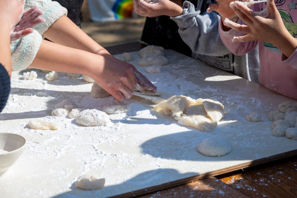 この日は、みんなで餅つきを行いました。石臼やせいろも自分たちで準備し、お父さん方が石臼を運ぶ場面では、頼もしさとありがたさを感じました。餅つきにあたっては、「1回目は大人がお手本を見せる」「2回目はこどもだけでやる。その間、大人は手を出さずに見守る」というルールだけ、リーダーから伝えさせてもらいました。蒸し上がったお米を臼に入れるところから、練る作業、餅を返す作業まで、2回目はすべてこどもたちだけで取り組みました。 大人が手を出さずに見守ることの難しさもありましたが、その分、こどもたちは自分たちで考え、声をかけ合いながら進めていました。出来上がったお餅はとてもおいしく、達成感のある時間となりました。