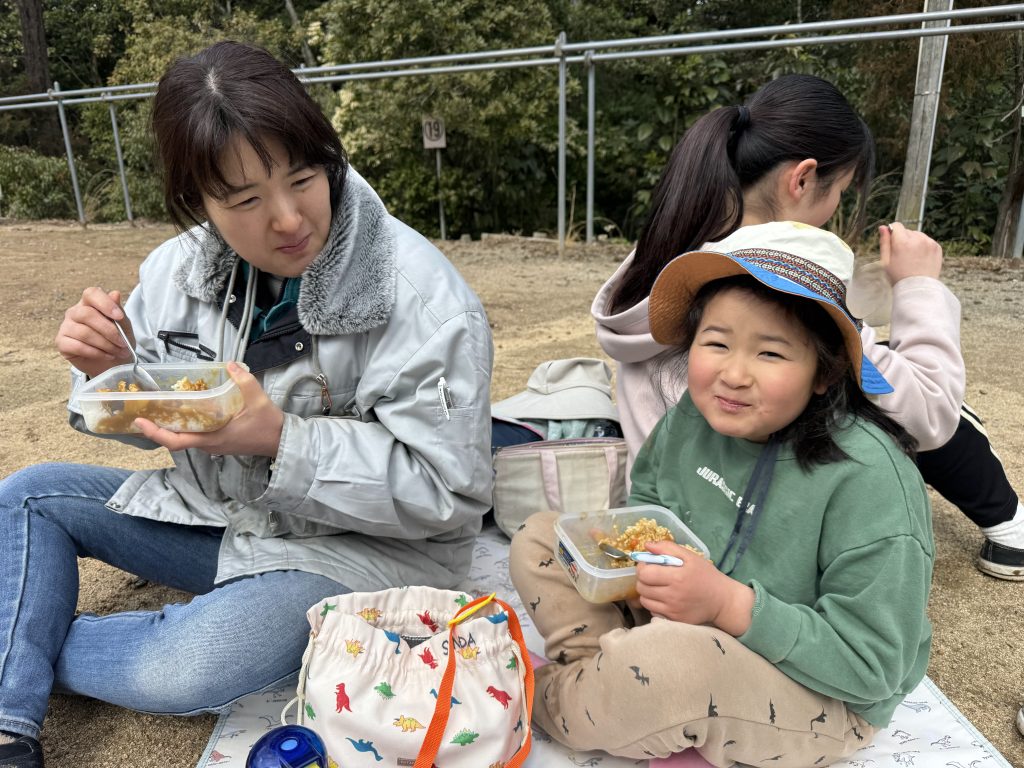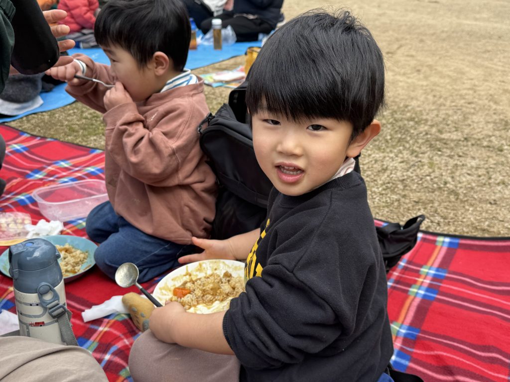 「おいしい!」「おかわり!」と元気な声が飛び交い、こどもたちもおうちの人もお腹いっぱい食べて、笑顔がはじけました。青空の下で食べるカレーは、格別の味でした。